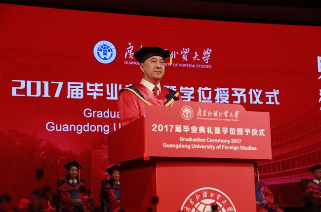 本网讯 6月23日,广东外语外贸大学在北校区云山会堂隆重举行2017届毕业典礼暨学位授予仪式,我院共有179名学子代表参加了仪式活动,接受校长拨穗正冠,授予学位证书并合影留念。