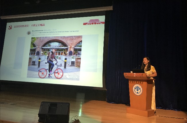 苏冬燕首先以暑期热门电影《战狼2》中的“吴京举着国旗的视频”为引入点,告诉同学们,今天的中国“是觉醒的雄狮”,“无论何时,请你记住你身后有一个强大的祖国。”随后,苏冬燕又插入一段国外记录中国发展的短片和介绍中国军工用品视频和图片,告诉同学们中国正在崛起的真真切切的现实,作为中国人,我们应该增强自豪感和责任感;每一个人应该珍惜我们所处的伟大时代,因为这个时代赋予每一个人梦想成真的机会,要牢固树立走中国特色社会主义道路的信念,让自己的青春梦与伟大的中国梦同向同行。