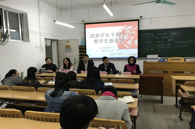本网讯 11月19日下午,继教中心成人学历教育班干部暨学生座谈会三教216课室举行,继教中心主任吴敦龙,副主任刘文明,项目主任杨变华,教务秘书张文吟,成教学生工作负责人陈明媚及各年级班干部及学生代表参加了会议,会议由陈明媚主持。