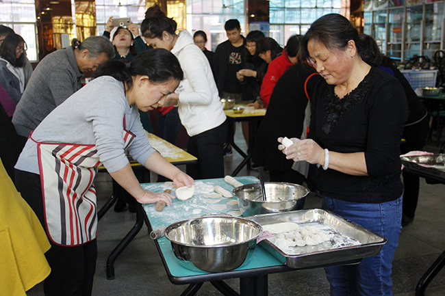 接下来就是紧张的包饺子比赛了,十五分钟之内,不但比数量,还要比外形。在苏姚的宣布比赛开始后,参赛选手们迅速行动起来,互相配合,有条不紊地包饺子。两位老师分工明确,擀皮、揉面、包饺子、把饺子摆放整齐,队员们配合默契。比赛时间结束后,工作人员依次摆盘上桌,只见各队伍包出的饺子形状各异,除了传统的样式,还有月牙形和元宝形等形状。点清数目后就是最令人期待的煮饺子环节,大家都焦急地等待自己的饺子出锅,等到热腾腾的饺子端出来,评委挨个点评和品尝打分,然后大家再相互品尝,交流,都吃的津津有味。
