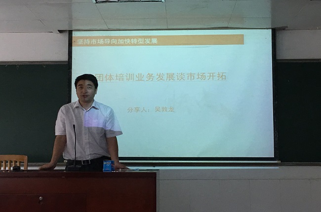 本次培训安排了团体培训开发中心主任吴敦龙、继续教育中心副主任白丽云分别介绍了各自部门业务开展情况和对相关工作的感悟。吴敦龙汇报了一学期以来团体培训开发中心业务开展情况,分析了目前面临的困难和问题,并提出了提升自身核心优势、不断打造拳头培训项目、对客户资源进行分类管理以及加强互联网在团体培训的应用等针对性措施;白丽云则结合学院举办团体培训项目的一些典型案例分析了高校服务社会的优势和劣势,并针对目前状况提出了意见和建议,包括提升办学条件、缩短培训合同周期、打造专业培训团队、建设高水平师资库、改进激励措施等方面。