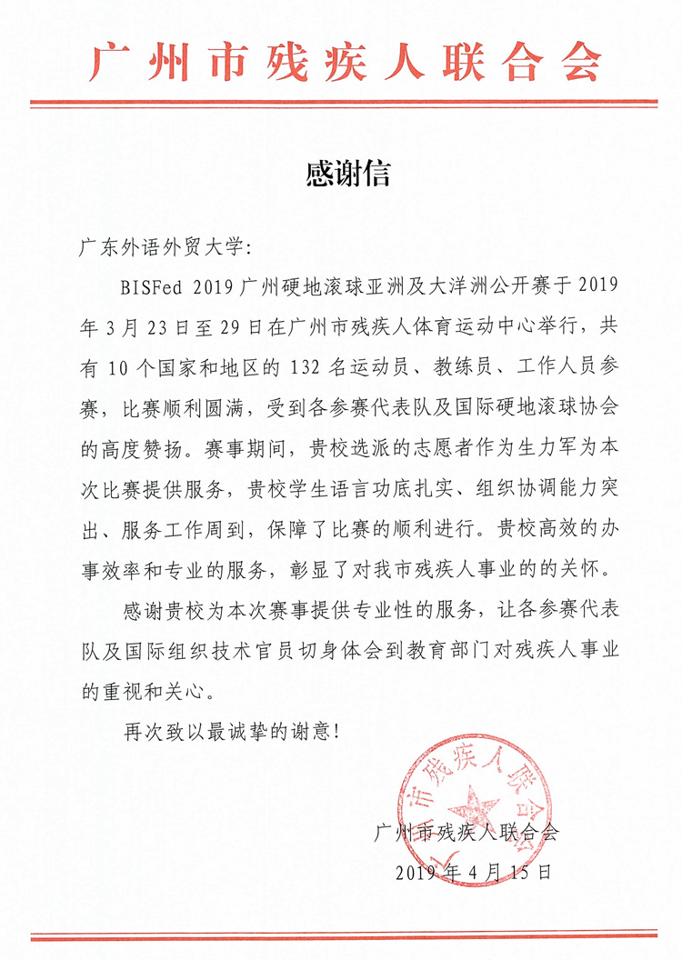又讯 4月15日,广州市残疾人联合会发来感谢信,再次感谢我校及学生志愿者们。