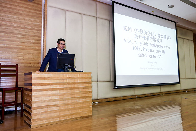 王伟强做题为“运用《中国英语能力等级量表》提升托福考培促学效用”的讲座。他以《中国英语能力等级量表》的阅读理解能力分量表与组构能力分量表的相关描述语为指导,解析了托福网考阅读部分所考查的学术英语阅读能力,并结合任务型教学法,探讨在备考实践中运用体系化、难度递增的阅读活动提升考生的学术英语阅读能力与考试表现。