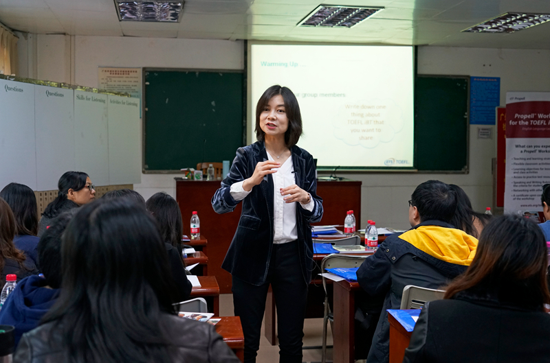 本次研讨会由美国教育考试服务中心主办,时长8个小时,内容覆盖了托福考试中的“听说读写”四大部分。培训以“warm up”环节拉开了序幕,杨莉芳副教授首先让现场老师根据平时教学经验分别就“Questions,Skills for Listening,Activities for Listening,Skills for Speaking,Activities for Speaking,Skills for Reading,Activities for Reading,Skills for Writing,Activities for Writing”进行了分享。随后,杨莉芳副教授从托福出题、备考、监考、打分、评分和复核等环节及重大改革进行了介绍,并围绕TOEFL iBT的听力、口语、阅读、写作四大部分结合诸多实例讲解了考查内容和评分标准,为老师们在英语教学方面提供了教学技巧和授课策略。为加强培训效果,老师们还进行了从“学生”到“评委”的角色转换,对托福口语和写作诊断评分。在问答环节,杨莉芳副教授还分享了实际教学经验。培训结束后,老师们还获得了ETS TOEFL Propell教师培训证书。