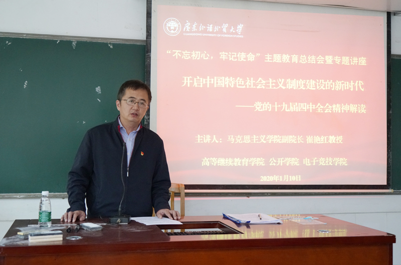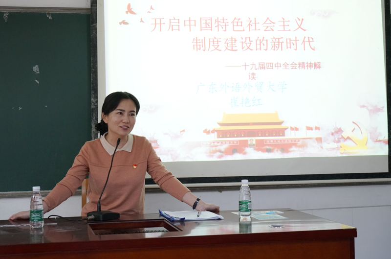 本网讯 在中国特色社会主义进入新时代的背景下,党的十九届四中全会聚焦坚持和完善中国特色社会主义制度、推进国家治理体系和治理能力现代化。1月10日,我院邀请马克思主义学院副院长崔艳红来院讲座,为教职工解读十九届四中全会精神。