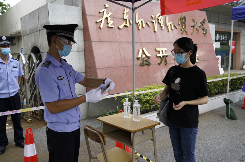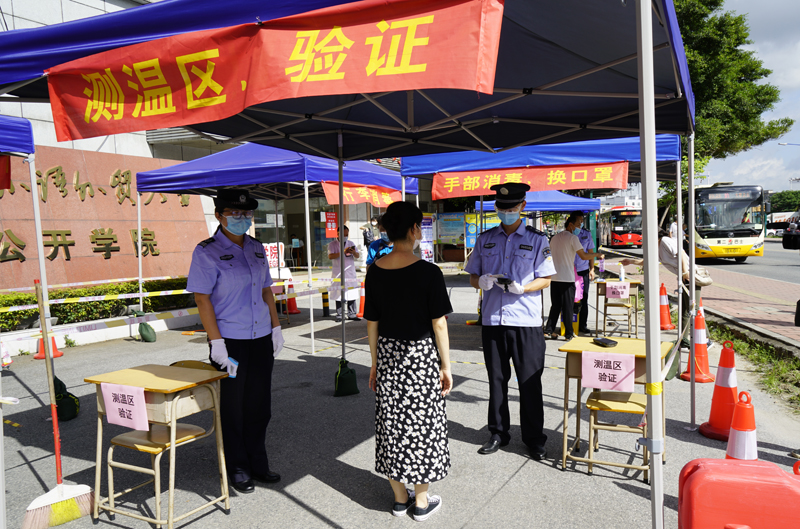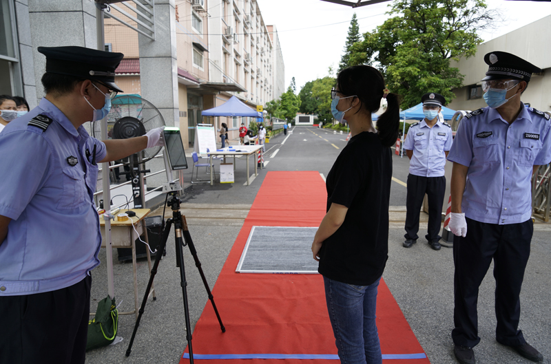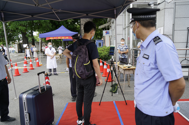 工作人员在入口查验返校学生身份,同时使用体温枪对学生体温进行初步测量
