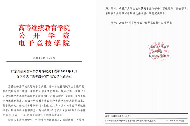 本网讯 为营造公开学院良好的学习氛围,进一步弘扬我院学生自强不息、积极进取的学习精神,激励广大学生奋发图强、努力拼搏,公开学院每年在广东省自学考试统考成绩公布后,由教务办公室和各系根据《公开学院自学考试统考高分奖奖励办法》(广外大继教〔2010〕31号)文件要求开展评选活动,该办法要求学生参加自学考试统考课程考试成绩在85分及以上,并且每次考试每门课程的奖励人数最多不超过本专业人数的10%。