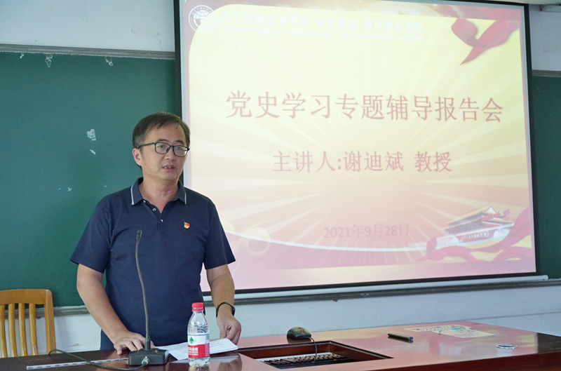 本网讯 9月28日下午,高等继续教育(公开)学院党委在白云山校区召开党史学习教育专题辅导报告会,特邀学校党史学习教育宣讲团成员、马克思主义学院院长谢迪斌教授主讲。学院全体教职工,白云山校区合作单位工作人员,学生党员代表等参加。报告会由学院党委书记邵兵主持。