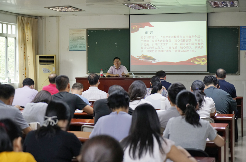 谢迪斌作题为《认真学习“七一”重要讲话奋力推进教育高质量发展》的辅导报告。具体从三方面展开讲解,一是必须把握“七一”重要讲话的主要精神、核心要义和重要观点;二是从教育角度解析“七一”重要讲话,指出教育事业改革发展的原则及方向;三是在教育事业的发展,特别是高等教育事业的发展过程中,我们如何按照习近平总书记的要求,在第二个一百年里坚持“为党育人、为国育才”的基本原则及立德树人的基本方向,联系实际开展各方面的工作。