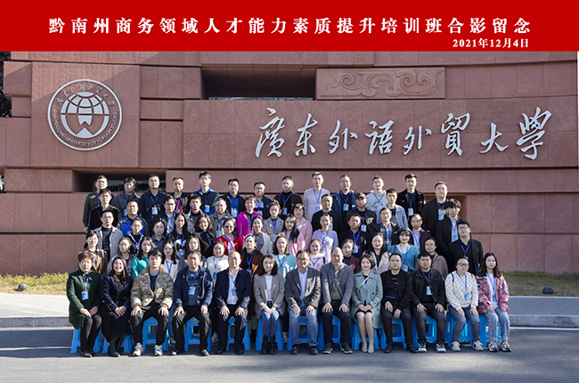 本网讯 12月4日,黔南州商务领域人才能力素质提升培训班在我校北校区开班。黔南州商务局副局长陈娅、二级调研员陈涛,广东外语外贸大学高等继续教育学院党委书记邵兵、副院长李天明,广东外语外贸大学马克思主义学院教授朱海龙以及黔南州商务领域的60位青年人才骨干学员出席了开班仪式。本次培训由中共黔南州委组织部黔南州商务局主办,广东外语外贸大学高等继续教育学院承办。