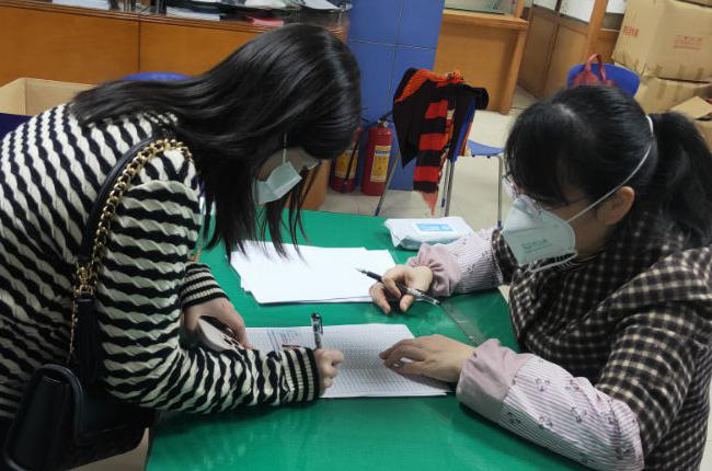 自考办拟定好详细的证书领取指引通知到每一位考生,并提前做好了场地布置、消杀等准备工作。发放当日,考生们陆续到场。证书发放过程中,排队领证的学生人数较多,自考办工作人员坚持做到每一个工作环节都热情服务,耐心对待,不马虎,不遗漏。按要求,学生们首先要在指定地点测量体温,并出示本人的粤康码及身份证原件。然后工作人员根据证件信息进行细致地核对,经确认无误后才发放学位证书和学位申请表给学生,最后要求学生在领取记录表上签名确认,以作备案,方可离场。