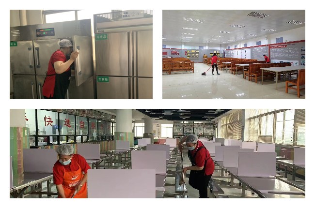工作人员对学校教学楼、图书室、球场、宿舍等公共场所开展了全面清洁和消毒;对学校周围的绿化带及草坪进行修整,为师生营造健康、卫生、整洁、优美的学习、办公、生活环境。从“心”开始、从“细”着手,清扫室内外每个角落,确保给师生们一个舒适、整洁的环境。