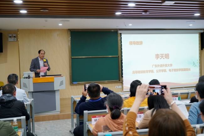 李天明首先代表学院欢迎学员们的到来。他向学员介绍了广外的国际化特色,同时介绍了高等继续教育学院开展的培训项目及取得的成绩。他强调,本次培训学员都是教育一线工作者,更要深入理解继续教育工作对保障基础教育质量、提升教师队伍水平的重要意义;要以身作则,带头学习,认真学习;要立场坚决,积极主动落实相关政策,切实做好继续教育服务的各项工作。他希望通过培训,大家开拓思路、创新方法,在今后的工作中,通过更多更好的措施推动各单位继续教育高质量发展。