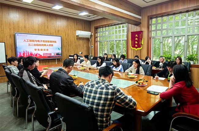 本网讯 11月30日下午在白云山校区第三教学楼207会议室,学院领导与电竞学院三二分段协同育人的学生代表举行座谈会。学院党委书记胡海娟、教务办主任樊春妍、学工办主任陈秋林,以及16名三二分段协同育人的学生代表参加座谈会。会议由学院党委副书记曾继平主持。