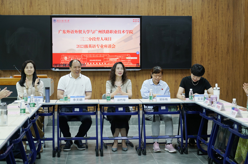 副院长李天明首先代表学院对广州铁路职业技术学院外语商贸学院副院长谈竹琴一行的到访表示热烈的欢迎,双方将共同为学生的全面发展做出努力。谈竹琴表示,看到学生们朝气蓬勃、神采奕奕,深切感受到融入广外所展现出不同以往的气质,这是值得庆贺的事。