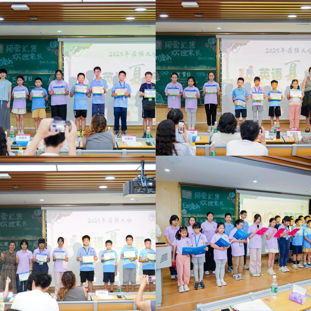 闭营仪式上,广外为优秀营员颁发荣誉证书。学员代表陈思奇用真挚的言语分享了参营感悟,引发现场观众共鸣。汇报演出则将现场氛围推向高潮:姚安宸等学员的诗朗诵《Spring Is Beginning》朝气蓬勃,字里行间满是青春活力;何秉乐、陈麒宇等学员参与的《海绵宝宝》《哈利波特》英语配音,发音地道、情感饱满,展现了扎实的语言功底;赵浠妍、陈思奇等学员通过作品展示,生动分享了文化艺术成果与研学见闻;全体师生合唱的《Lemon Tree》旋律悠扬,传递出不舍与温情。家长们对夏令营给予高度认可,纷纷表示“孩子不仅开口说英语更自信了,还交到了好朋友”,并期待明年再次相聚。