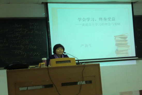 “你期望的大学生活是什么样的”,“你对大学生如何下定义?”这是严老师在讲座前向同学提出的思考。跟随着这两个问题,严新生从“小沈阳论大学生活”,“蔡元培论大学生活”两个典故总结出了真正的大学生应该是“自信、自知、自治、自强”之人,而一个人如果有了自治的能力,必定能够成就一番事业,这就是所谓的“自主学习(learner Autonomy)”。严新生从专家学者的观点与论述中给大家分析了提倡自主学习的重要性。 她认为自主学习既是学校教育的基本目标,也是个人生存与成长和社会发展的需要,同时也是学习型社会的必要条件。随后,严新生给大家介绍了自主学习概念提出的渊源,并解释了自主学习的内涵,她说:自主学习就是学习者有能力对自己的学习负责。那么该如何实现自主学习呢?结合中西方的专家研究结果,并结合自身研究的实践,严新生提出了实现自主学习的简单实用的三步曲:1、学会反思;2、学会制定目标;3、学会自我激励。同时详细分析了这三步曲的内容和方法。严新生最后总结说:学会学习,终身受益。从今天开始,运用我们所介绍的三种策略:反思、制定目标和自我激励,你就能发生变化,就能一步一步地走向成功。相信自己,你能做到。