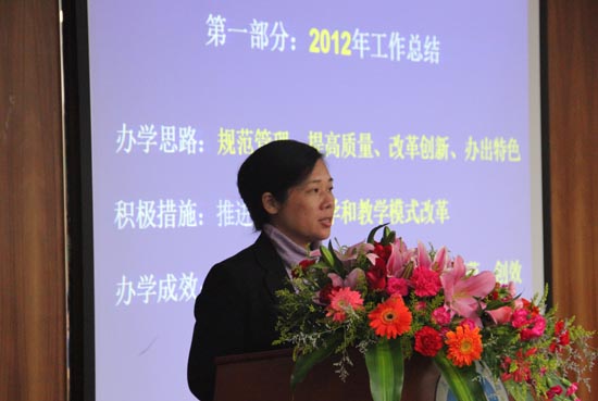 院党委副书记苏冬燕首先对我校成人高等教育一年来的工作进行了总结,她从调结构、促规模、保质量、抓规范、创效益等五个方面总结了全年的工作情况,对所取得的成绩做了充分的肯定。她指出,过去的一年,是我校成人教育快速发展的一年,学院积极适应成人教育发展的新形势,主动调整结构,优化站点布局,增加办学项目,探索新的教学模式;恰当的措施促进了规模的发展,今年我校录取成人高等教育新生3947人,待明年2013级学生报到后,成教在校生将超过9000人;在适度稳定办学规模的同时,坚持质量标准,深化教学改革,努力提高人才培养质量;同时进一步加强了制度建设与信息化建设,强化了过程管理。