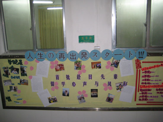2012级1班同学也不甘示弱,大家齐心协力完成了墙报的制作。他们的板报题目是——感悟青春,把握时光。鲜明的色彩,合理的布局,别致的布置,板报整体设计体现了他们积极向上、初生牛犊不怕虎的精神。特别值得一提的是2012级2班同学承办的日语出国培训部总宣传栏,开辟了“风采展示”专栏。专栏除了展示日语出国培训部优秀学子的风采,还加入了重量级的内容——日语出国培训部首批已赴日留学的师兄师姐从日本发回来的报道,做成“首批赴日留学学子心得与风采”专栏,以给正在国内学习的师弟师妹们一个激励和鼓励作用。