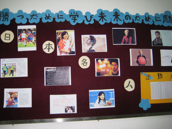 各班充分利用班级的宣传栏,设计出了非常精美的宣传板报。2012级2班的宣传栏由“干部示范岗”、“精彩瞬间”、“学习园地”组成,“干部示范岗”将班干部的照片、职责和服务宣言都张贴在这里,示范榜样和监督警示作用显而易见;“精彩瞬间”栏目里,一张张学生活动的照片见证了学生参与集体活动中的种种幸福回忆,新颖而独特;“学习园地”则收集了日本文化的有关知识,让同学们能随时随地感受到日本的文化。