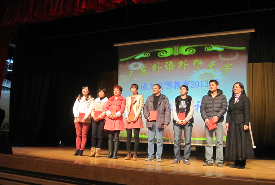 典礼的最后进入表彰环节,苏冬燕宣读了广外继教【2012】92号文《关于表彰成人高等教育2013届毕业生学习奖和优秀学生干部获得者的决定》。根据《广东外语外贸大学成人高等教育学习奖和优秀学生干部评选办法》的规定,学院对每一届毕业生中表现突者予以表彰。本届毕业生中共有28名同学获得“学习奖”一等奖、62名同学获得“学习奖”二等奖、65名同学获得“优秀学生干部”称号,何勇斌、苏冬燕及林碧玲分别向获奖的毕业生颁发荣誉证书并一起合影留念。