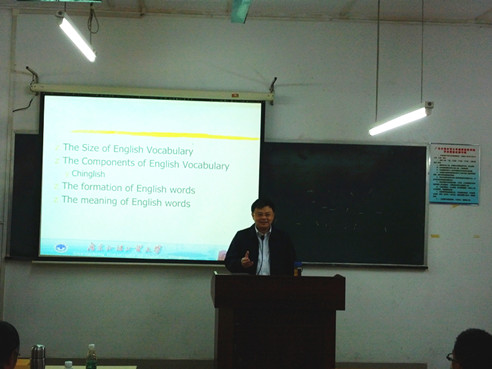 开学典礼学术讲座环节邀请了何勇斌为全体学员带来了一场主题为“英语词汇学习”的学习方法讲座。何勇斌从中国学生词汇学习的误区、词汇的构成、中式英语以及英语词汇的形和义几方面进行生动的讲解,鼓励同学们用正确的方法记忆词汇而且要持之以恒。何勇斌专业而风趣的演讲方式调动了全场气氛,全体学员积极做笔记,现场气氛非常活跃,讲座结束后同学们表示对词汇学习更有信心了。