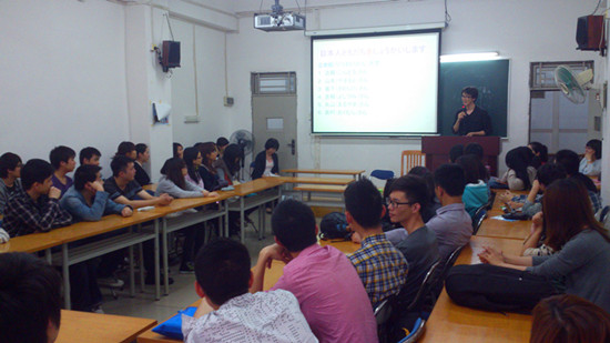 首先,日韩语项目部负责人桂燕玉老师对举办本次活动的宗旨、目的,以及活动的流程进行了说明。然后,由来自日本的留学生逐一进行了中日文的自我介绍,日本留学生准确的发音、饱满的热情,赢得了在场学生的热烈掌声。