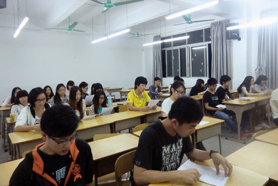 同日晚7:30,同学们准时来到一教205室排练,他们从班干部手里领到歌词后,就自觉地和着音乐开始练习。两天时间排练一首新歌非常不容易,但是同学们没有一个抱怨的,教室里一遍又一遍地回荡着这段感人肺腑的旋律。练习一段时间后,班干部就歌曲的编排、手语的配合和服装的选取等问题,征求大家的意见。同学们经过认真的思考后,纷纷表达自己的想法。当来自四川的胡安龙同学提出,希望自己能够在合唱之前献上一小段朗诵时,教室里响起一阵雷鸣般的掌声,为他的自告奋勇,更为他所表达出来的深深的同胞情。