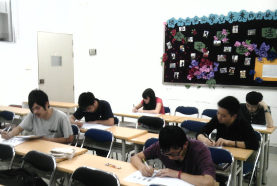 入学考试主要分三个部分,分别为日语基本能力测试、日语写作能力测试和面试。基本能力测试的考试题目均为客观选择题,主要考察学生对日语词汇和语法知识的掌握程度。日语写作能力测试则要求学生完成一篇关于所报读专业和留学规划的小论文,字数为800~1000字。旨在考察学生较高水平的日语能力,尤其是在日后的学习中必须的日文书面表达能力和对问题的思考及分析能力。面试在三教118教室进行,日方老师对考生一一面试,除了测试学生的日语口头表达能力外,也了解了学生的留学意图及留学费用负担等情况。面试内容主要涉及个人的兴趣爱好特长、大学期间参加的课外或社会实践活动、留学目的、报考学科、及留学生活设想、毕业后的计划等。面试老师中日文并用,而且态度和蔼、语言风趣,减少了学生的紧张感。