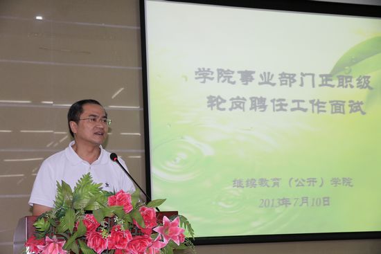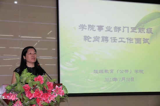本网讯 为强化干部竞争机制,提高管理业务素质,建立符合继续教育办学规律、充满生机和活力的用人制度,本学期,学院首次开展了事业部门正职级轮岗聘任工作。2013年7月10日上午,学院在公开学院学术报告厅召开了事业部门正职级轮岗聘任面试会,对轮岗报岗干部进行公开面试。参加会议的人员分别有学院领导、各部门主任、副主任、教研室主任、部长、主管,以及培训体系全体项目负责人。本次面试会由学院党委书记苏冬燕主持。