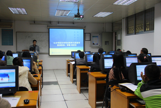 本网讯 11月14日下午,学院在公开学院第一教学楼602组织了2014年1月自学考试委考和实践考核课程命审题工作培训会,副院长任跃忠、教务办主任吴敦龙和各系主任以及参与本次命、审题的教师参加了此次培训会,会议由吴敦龙主持。本次将完成本学期65门课程的命、审题工作,比去年增加21门。