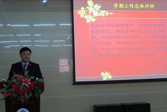 院长何勇斌首先代表学院领导班子就本学期学院各项工作作了总结报告。他指出,本学期学院在大学的正确领导下,团结依靠全体教职员工,围绕学期初制定的工作目标,积极改进工作作风,进一步完善运行机制,积极开拓市场,保持了稳定,实现了学院事业的发展,为今后工作的开展奠定了较好的基础。何勇斌既肯定了学院发展的良好成绩,也指出了办学过程中遇到的困难和存在的问题,并对下学期的学院工作提出了殷切希望。