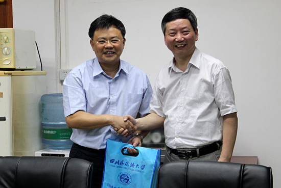 座谈会结束后,乐勇代表四川外国语大学向学院赠送了礼物,何勇斌陪同乐勇一行参观了广外校园。