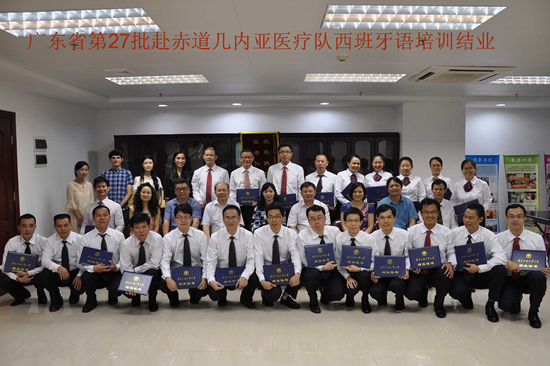 本网讯 5月20日,由我院承办的广东省第27批援助赤道几内亚医疗队出国前西班牙语培训圆满结束。结业典礼在仓边路广东省卫生医疗对外合作服务中心培训基地二楼课室举行。广东省卫计委交流合作处处长周紫霄,继续教育学院院长何勇斌,广东省卫生医疗对外合作服务中心主任张铁强及其副主任张爱华,学院培训办公室主任蒋小平,教学总监吴文权及所有授课老师参加了该结业典礼,典礼由张铁强主持。