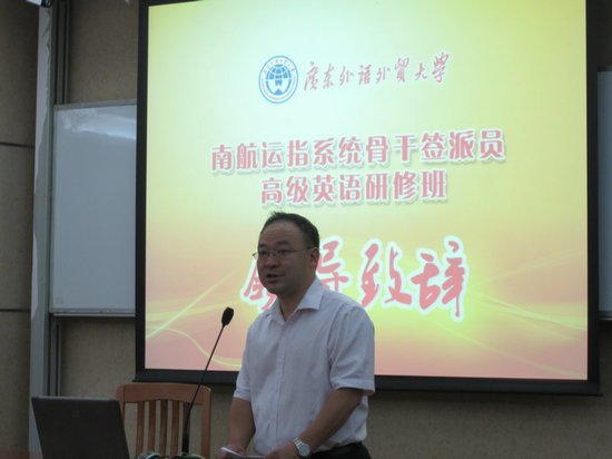陈开举首先代表继续教育学院对中国南方航空公司的领导、全体学员的到来表示热烈欢迎,感谢南方航空公司对广外的认可,对广外继续教育学院的信任。同时陈开举表示,本次培训班广外不但提供了优美的学习环境,还配备了一支优秀教师团队,完善的管理和服务,希望全体学员好好把握机会,每周或每天总结所学的知识,掌握一套适合自己的学习方法,全面提升英语水平。