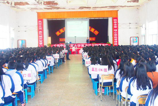 本网讯 2015年1月底,我院招生宣讲团队在院长助理李梅庭的带领下,前往广东普宁市各高级中学,为即将毕业的高三学生开展“广东外语外贸大学英语学习秘笈”系列宣讲活动,受到当地师生的热烈欢迎。