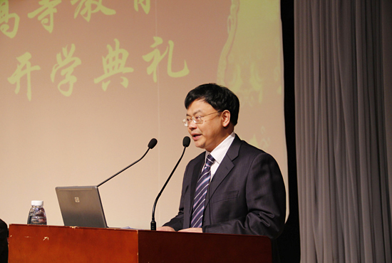 开学典礼伴着嘹亮的国歌声正式开始。首先是何勇斌致辞,他代表学校向分布在广东全省各个教学点的3700多名2015级成教新生表示热烈的欢迎和衷心的祝贺,并向新生全面介绍了广外以及继续教育(公开)学院的发展变化。他说,广外作为一所具有鲜明国际化特色的广东省重点高校和华南地区人才培养的重要基地,建校以来,践行“明德尚行,学贯中西”的校训,以培养全球化高素质公民为使命,着力推进专业教学与外语教学的深度融合,为社会培养了大批高素质的国际化人才。广外成教始终坚持“全人教育,追求卓越”的办学理念,不断拓展办学规模,目前在读学生人数已超过万人。