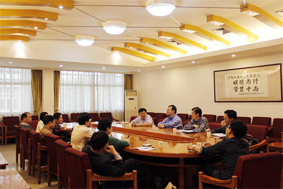 随后,与会双方就对口工作进行交流。迟殿堂介绍了学校当前外语学科建设和小语种专业的发展情况及新专业考核评估方案。王则唐介绍了我校在增强学科建设整体性、协同性、系统性方面的措施。陈闰介绍了我校师资强校战略的做法。何勇斌对我校校际合作情况作了简要说明,并就近期合作办学情况作了详细介绍。