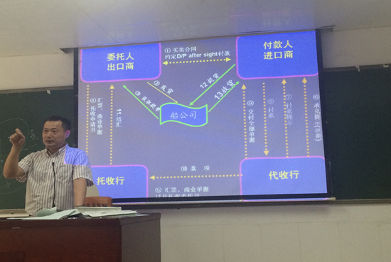 伍雁南本次示范课的主要授课内容为“汇付与托收”。首先,伍雁南和同学们回顾了上一次课的知识要点,“温故而知新”的授课方法提高了知识传授的连贯性和一致性。虽然“汇付与托收”在国际贸易实务课程中属于较难理解的部分,但伍雁南凭借自己对教材的深入理解及丰富的教学经验,利用图表分析和对比的方法对常用支付方式进行细致的讲解。伍老师生动的授课让整个课堂气氛活跃,师生间展开了良好的互动。每讲到一个支付方式,他都列出相应的思考题,启发学生主动思考和分析。
