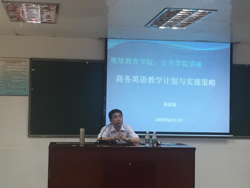本网讯 6月15日下午,大众外语教育研究中心在校本部三教220举行了题为“商务英语教学计划与实施策略”的教师培训讲座。本次讲座由广东外语外贸大学商务英语学院的张武保教授主讲,学院全体英语教师参加了本次讲座。