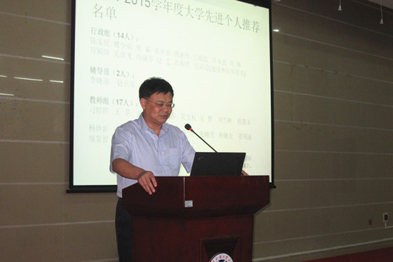 何勇斌宣读了大学《关于评选2014—2015学年度先进集体和先进个人的通知》、“翼群服务奖”和“翼群教学奖”的评选条件,并公布了候选者名单及推选名额:从获得大学2014年年度考核优秀等次的33人当中推选9人为大学本年度“先进个人”,并根据学院在岗人员各类岗位的比例推选教师4人、行政人员4、专职辅导员1人;从符合条件的22人当中推荐1人为“翼群服务奖”候选人;何勇斌为“翼群教学奖”唯一符合条件者。全体教职工投票推选了年度“先进个人”和“翼群服务奖”候选人;全体专职教师对“翼群教学奖”候选人进行了投票表决。投票结果由学院相关职能部门负责统计,经学院党政联席会议确定并在全院进行公示后上报大学。