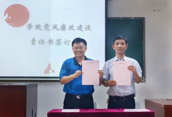 专题报告之后,是党风廉政签约仪式。按照《学院党风廉政建设工作暂行办法》文件要求,何勇斌代表学院与各部门负责人签订了党风廉政建设责任书。