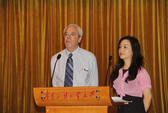 首先,美国国际教育集团总裁John讲话。他介绍了美国教育集团同广外大合作的历史,表达了再次来到中国的激动心情。他说,本次派驻的外教团队经过精挑细选,具备优秀的教学能力和良好的综合素质;希望学员们能够珍惜这个接受良好教育的学习机会,从而提高自己的英语学习能力,学有所得。