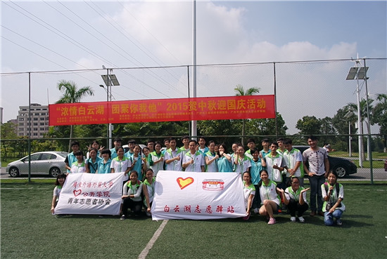 本网讯 9月25日上午,公开学院青年志愿者协会到白云湖参加“浓情白云湖,团聚你我他”2015贺中秋迎国庆活动。本次活动由共青团白云区委员会主办,白云湖街道团工委承办,我院协办,旨在关爱来自异乡的环卫工人,让他们切实感受到社区的温暖。