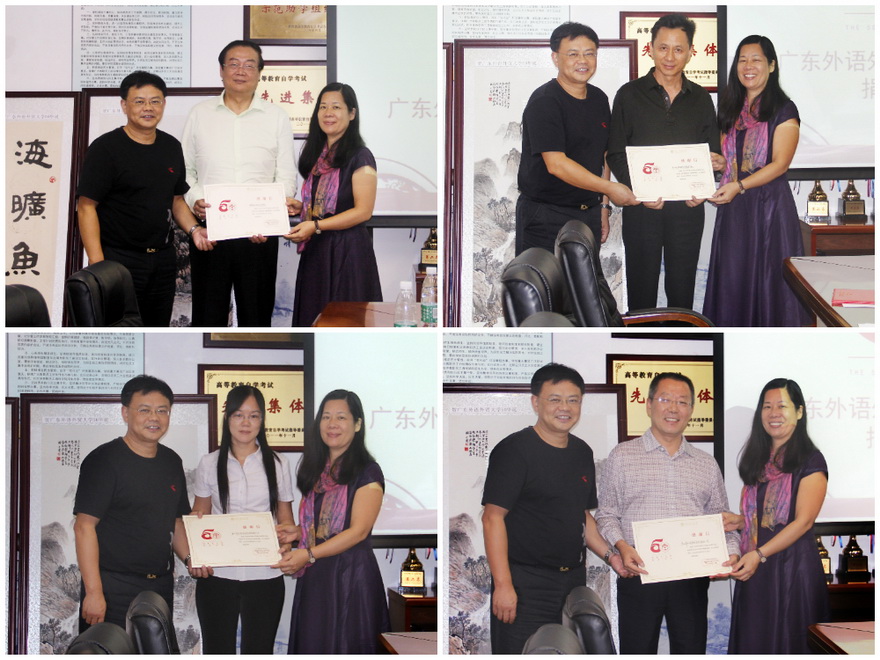 本次向我校50华诞献礼的是与广外成人教育合作办学及公开教育合作办学的合作单位。到贺代表分别有,珠海市外经贸专修学院负责人施隆光及随行人员,达德自学考试辅导机构代表刘凤林、广州东方标准信息科技有限公司代表李海萍和广州帝虬教育信息咨询有限公司代表范业山。多年以来,上述合作单位与我校在成人教育和公开教育合作办学领域取得良好的社会效应。