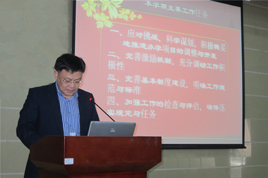 何勇斌以“转变观念,奋发有为,着力推进学院转型发展”为主题,提出了本学期学院的总体工作思路:把握政策,适应市场,通过科学的谋划,积极稳妥地推进学院办学项目的调整与开发;规范管理,完善制度,通过管理水平和能力的提升,增强学院的核心竞争力;改善条件,营造氛围,通过学院良好形象的塑造,扩大学院的影响力。何勇斌在分析上学期工作不足之处的同时,分别从办学项目的调整与开发、激励机制的健全、工作规范性的建设、工作任务的检查与评估等十个方面提出了本学期的主要工作任务。何勇斌认为要及时应对市场的变化,把握办学的政策,调整办学的项目,并着重于五个方面提出了工作要求:履职尽责,勇于担当;转变观念,适应变化;顾全大局,着眼长远;遵规守纪,精诚合作;加强学习,提高能力。