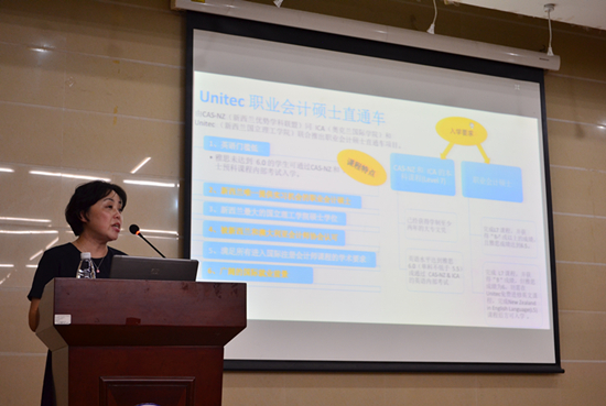 本网讯 6月22日晚,艺信系在夏茅校区学术报告厅举办艺术类自考专业与新西兰本科、硕士相沟通项目宣讲会。宣讲会主讲嘉宾为新西兰优势学科联盟秘书长刘文影女士,主持人是艺信系常务副主任丁建华。