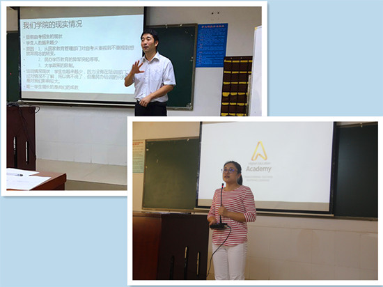 在7月6日上午的培训中,学院院长何勇斌以影剧为例对“学生喜爱的老师”进行了归纳分析,并由此开题对“优质教学”、“优秀教师”、“教师发展途径”等内容结合多年的教学和管理经验进行了详细的阐述。何勇斌通过丰富的教学案例分析强调了教学反思及总结等途径在实际教学中的重要作用。在第二场培训中,董秀清老师在学习吸收总结英国高等教育学会Kathy的教学方法后,将学院教师分成8个小组通过形式多样的互动教学模式对如何开展有效教学与在场的老师进行心得分享。7月8日,吴敦龙老师结合学院自考、成教发展现状从“翻转课堂翻转了什么”、“为什么要翻转课堂”、“微课程教学法的原理与方法”“微课案例”4个方面对“翻转课堂与微课课程教学法”进行了深入分析。