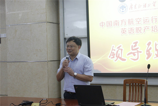 本网讯 11月8日上午,第七期南航运指系统英语脱产培训开班典礼在第六教学楼103举行。广外继续教育学院院长何勇斌、党委书记苏冬燕、副院长任跃忠,南航股份公司运行指挥中心纪委书记夏志祥、管理部副经理徐明明及第七期25名学员参加了开学典礼。