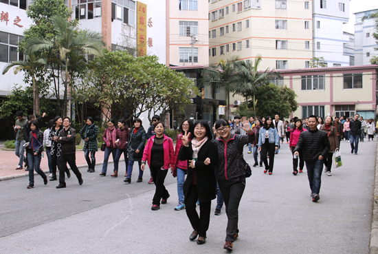 此次的环湖徒步走活动,以工会小组为单位,先在学校操场集中,然后徒步至白云湖集合点,全员先到齐的小组方可先开始环湖走活动。在经过从学院到白云湖的一段路程热身后,老师们渐渐进入状态,下午3点,各个工会小组浩浩荡荡的从白云湖规定起点出发。